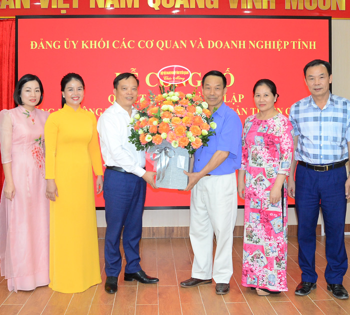 Đồng chí Trần Việt Hùng, Phó Bí thư Thường trực Đảng ủy Khối các cơ quan và Doanh nghiệp tỉnh trao Quyết định và tặng hoa chúc mừng BCH Đảng bộ Công ty cổ phần Lâm sản và Khoáng sản Tuyên Quang.