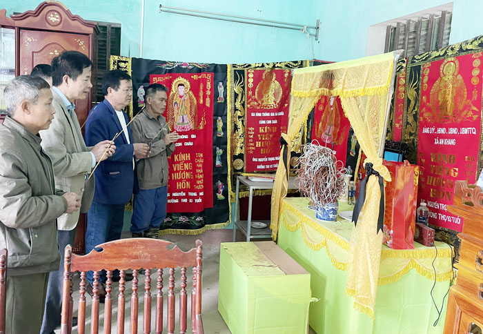 Ông Triệu Quang Nghị và ông Trần Khắc Thơi đến thắp hương cụ Nguyễn Văn Ngân cố Bí thư Đảng ủy xã An Khang (TP Tuyên Quang) và tặng quà, phong bì 300.000 đồng đến gia đình.