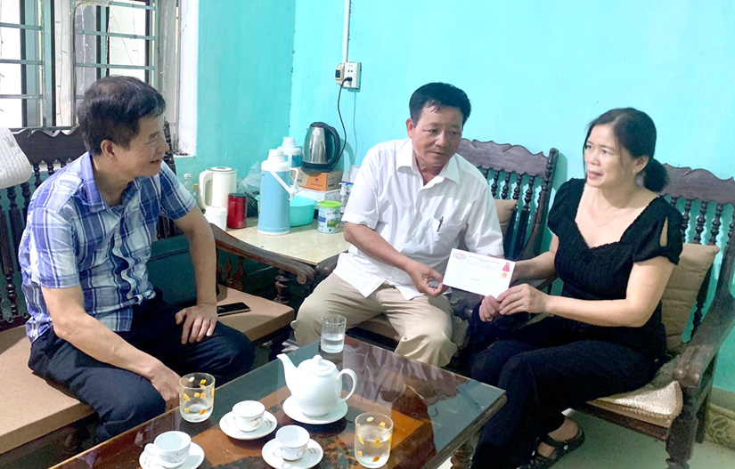 Ông Triệu Quang Nghị cán bộ pháp chế Công ty tặng quà cho thương binh Trần Khắc Minh, thôn Phúc Lộc A, xã An Khang. Ông Minh còn là người được ủy quyền thờ cúng liệt sỹ.