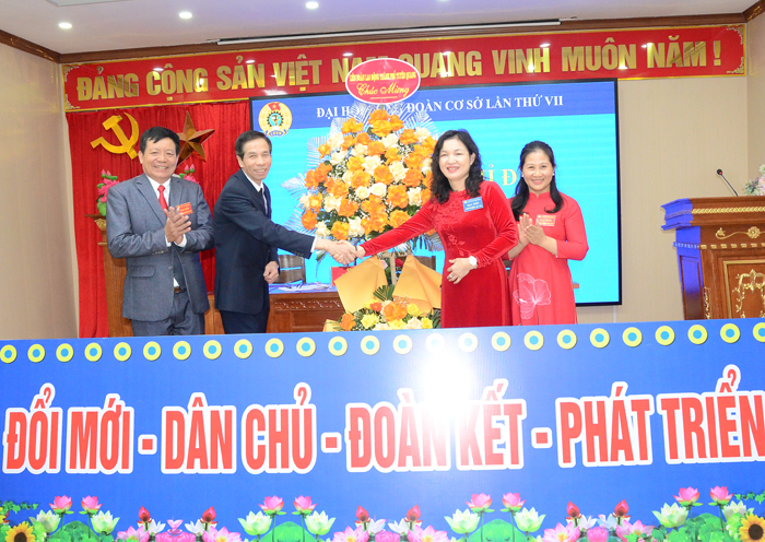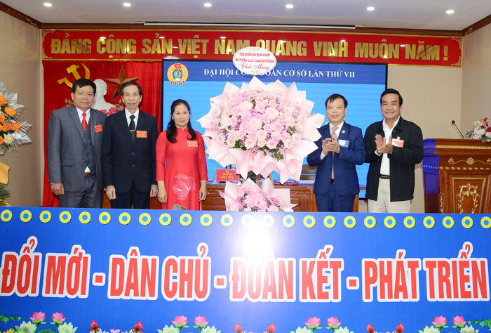 Ông Nguyễn Phương Nam và ông Hoàng Minh Sáu, thay mặt chi bộ, HĐQT và Ban giám đốc Công ty CP Lâm sản và Khoáng sản Tuyên Quang, tặng hoa chúc mừng Đại hội lần thứ VII Công đoàn Công ty CP Lâm sản và Khoáng sản Tuyên Quang.