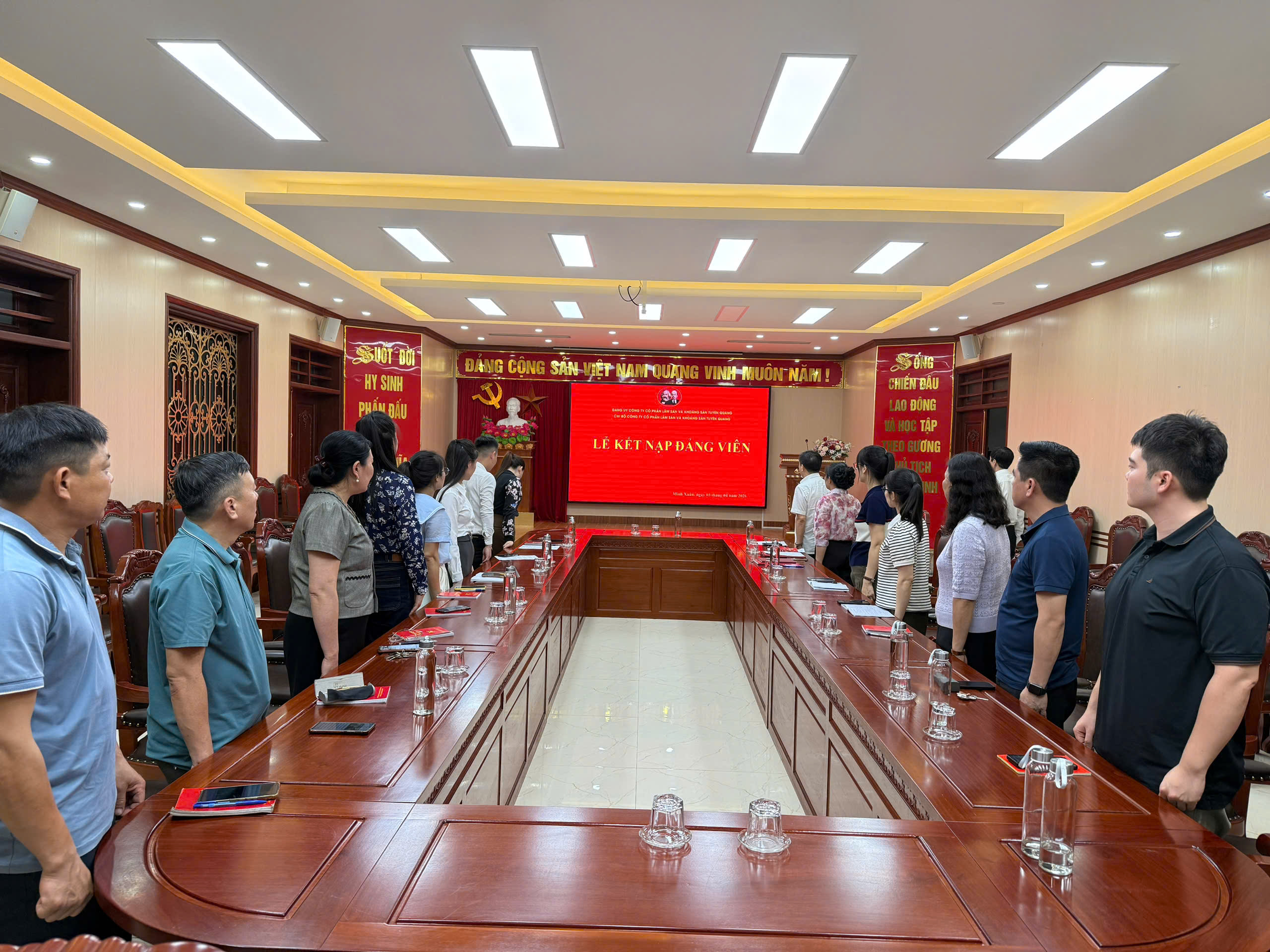 Buổi lễ kết thúc trong không khí trang trọng, đoàn kết và phấn khởi. Các đại biểu, đảng viên cùng chụp ảnh lưu niệm, ghi lại dấu mốc quan trọng trong công tác phát triển Đảng của Chi bộ Công ty cổ phần Lâm sản và Khoáng sản Tuyên Quang.