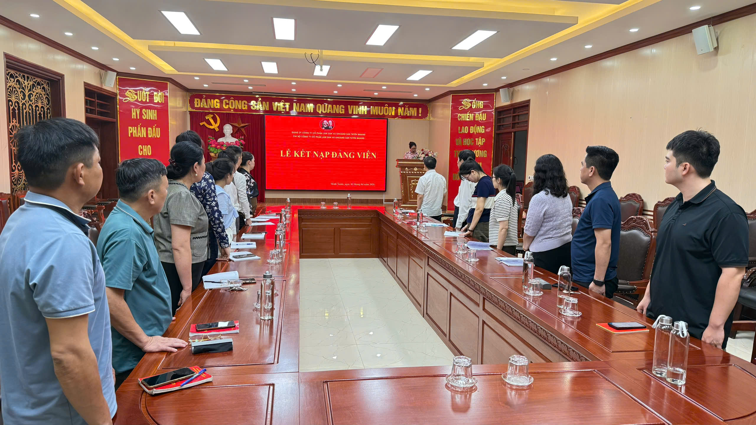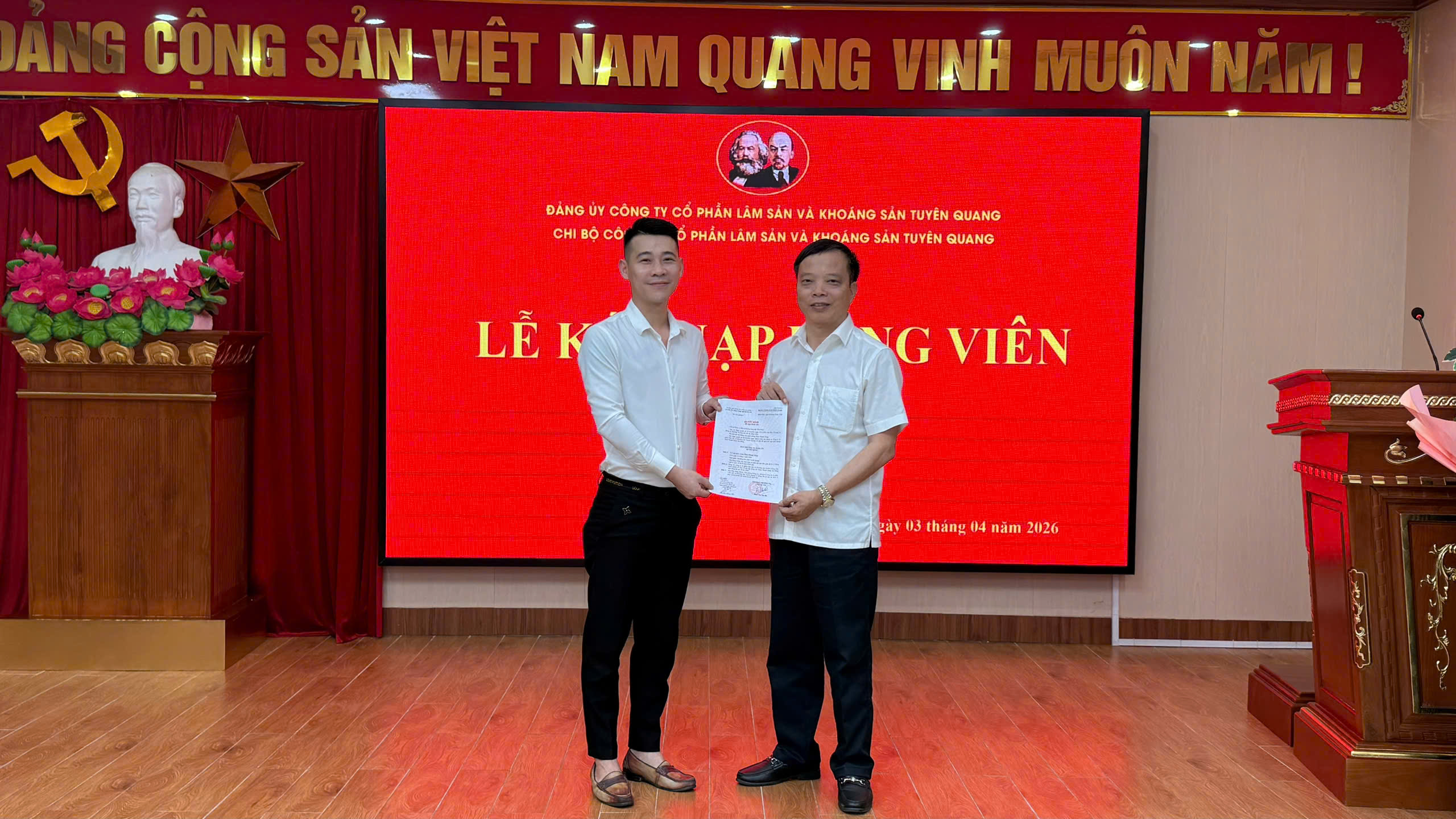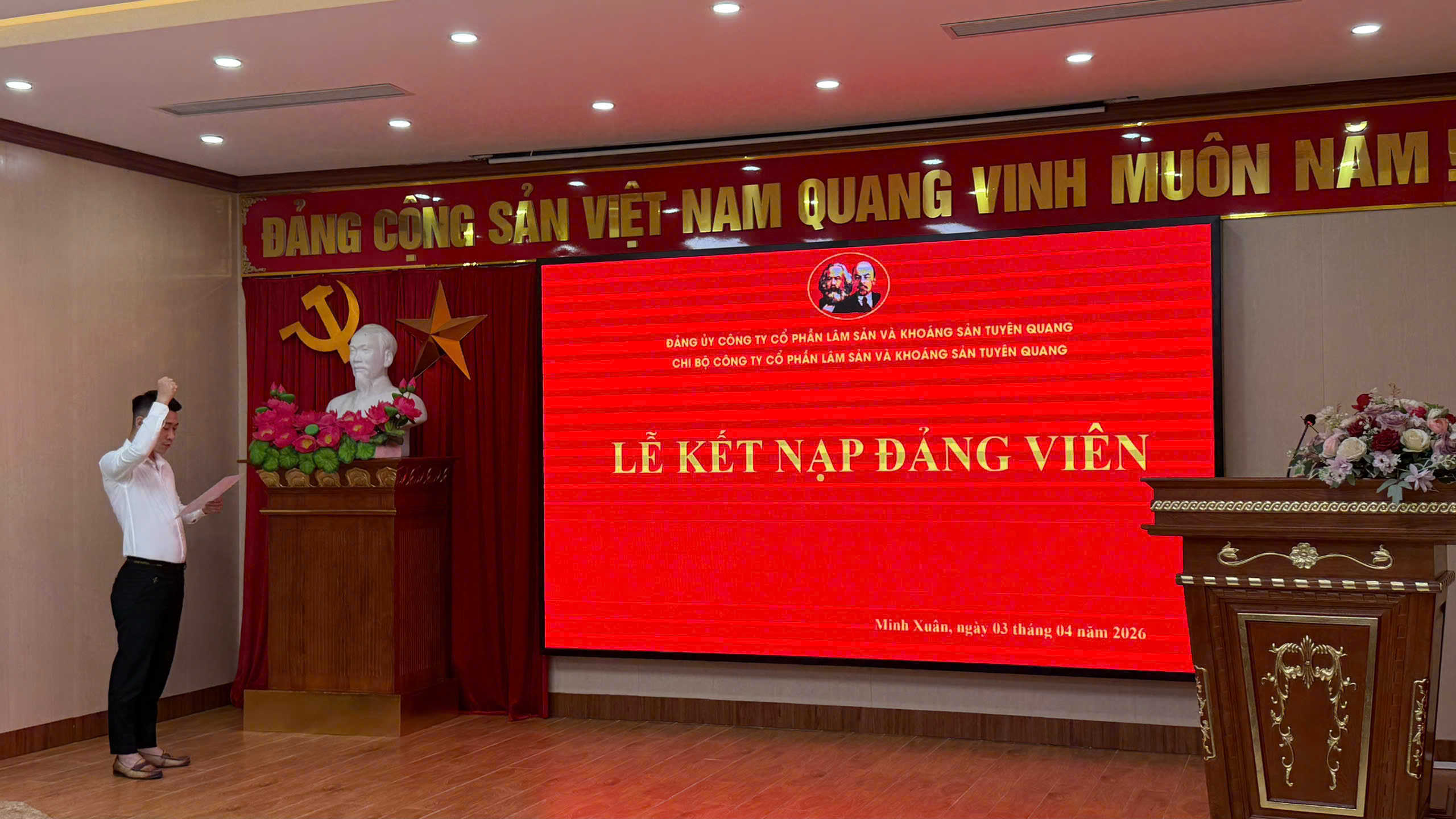 Chiều ngày 03/4/2026, tại Hội trường Công ty cổ phần Lâm sản và Khoáng sản Tuyên Quang, Chi bộ Công ty đã long trọng tổ chức Lễ kết nạp đảng viên mới cho quần chúng ưu tú Thèn Thanh Tùng. Buổi lễ diễn ra trong không khí trang nghiêm, đúng quy định của Điều lệ Đảng thể hiện sự quan tâm của Chi bộ trong công tác phát triển đảng viên, góp phần xây dựng tổ chức Đảng ngày càng vững mạnh trong doanh nghiệp.
